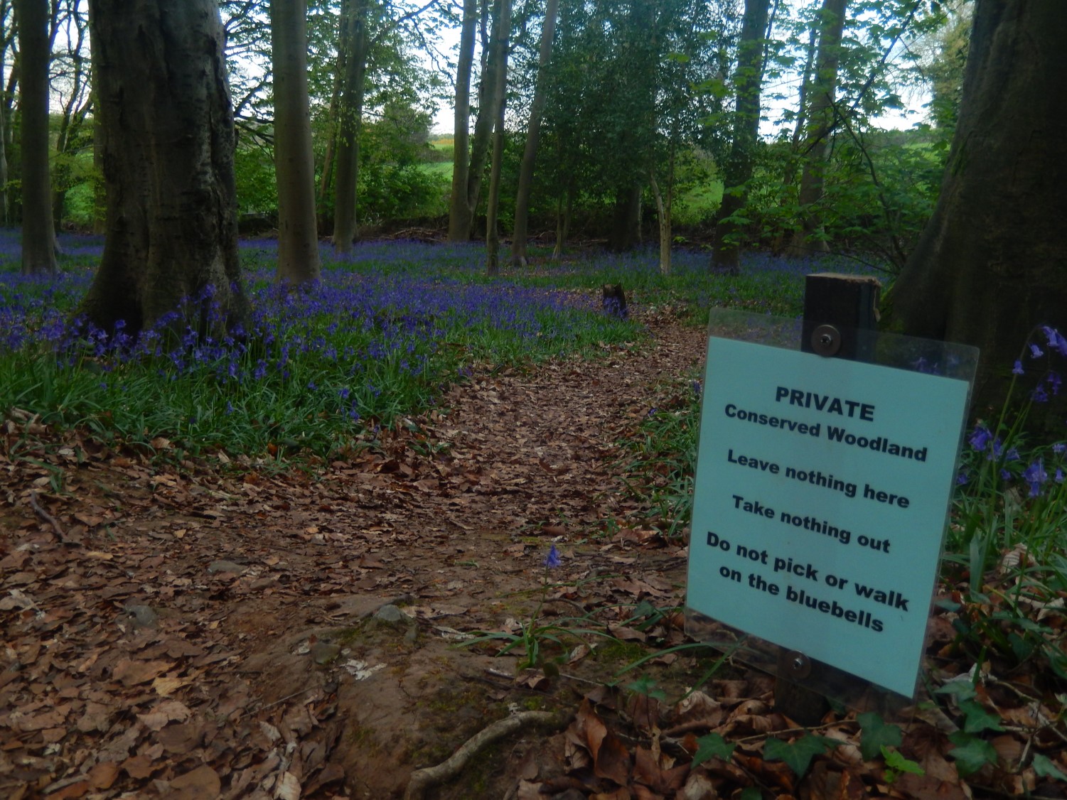 Small signs welcome you to explore the area, provided that you do not tread on or remove any of the bluebells, which is perfectly understandable. Dog walkers and families often park on the edge of the road, although there is no official car park this far up the road.
