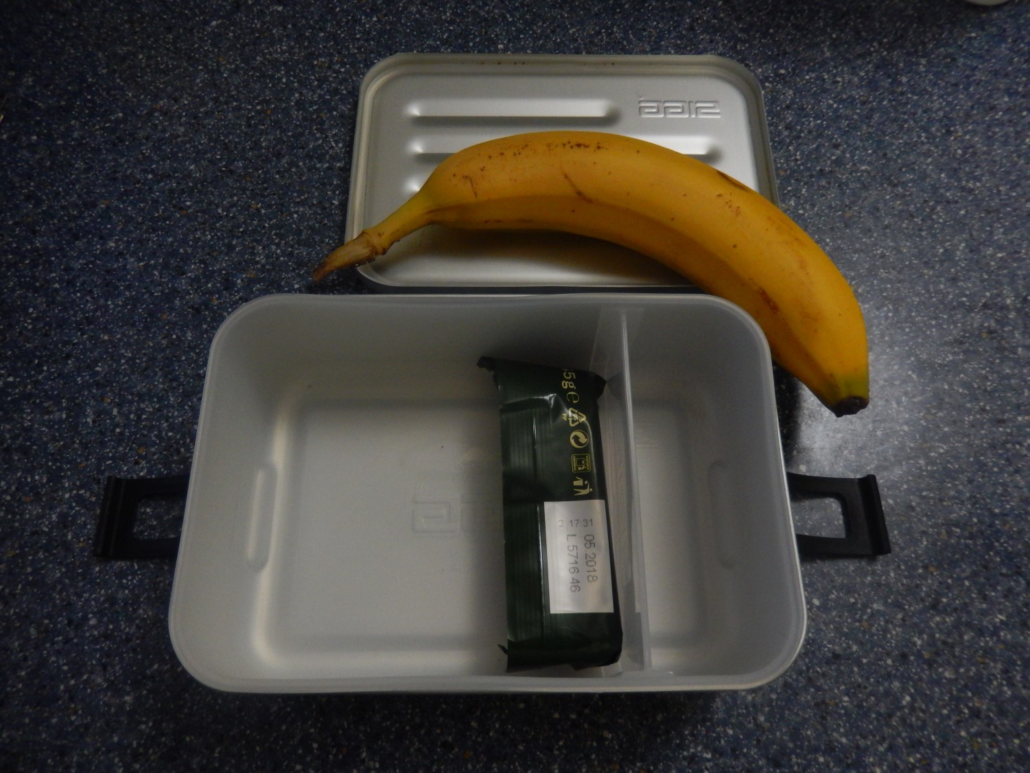 Okay. So, it’s too small for your average banana and a whole apple probably won’t fit. But I can squeeze in my sandwiches (not pictured) and its the perfect width for flapjacks, chocolate and other kinds of bar.