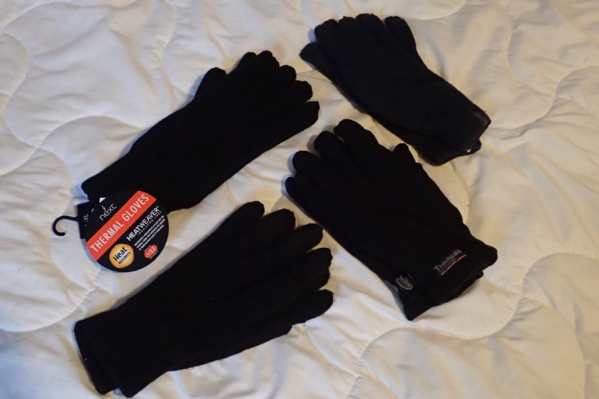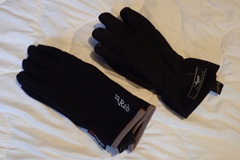 I’ve been wearing the silk gloves under my waterproof gloves and my hands are definitely warmer for it. I also find it’s easier to slip the main gloves on and off. My green merino gloves are there as spares and for general dry weather. I can even wear them without the Rab gloves on top.