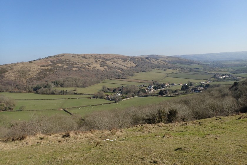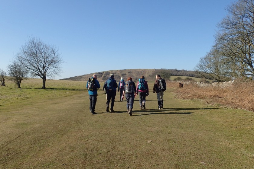Descending to lowland territory, we stopped on the hillside before Webbington Road and found a near-perfect space for lunch. Sheltered from the biting easterly breeze but in full view of the early-spring sunshine.