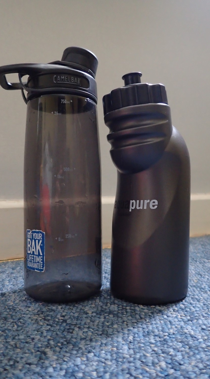 In addition to this, I packed and carried two (empty) bottles… On the left, the Camelbak Chute was mainly for collecting water at the camp site (or for diluting an energy tablet), while the bottle on the right is from Pure Hydration and features a built-in water filter. This one can also be squeezed, so that you can use it predominantly to fill other devices with safe water.