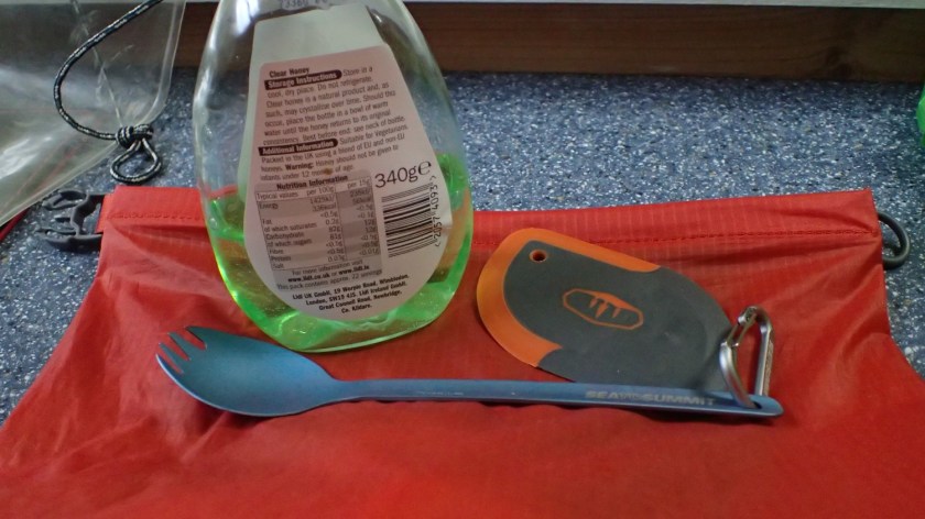 If not the clothes then, the food and cooking items were going to be the heaviest on my list. In the 6lt dry bag I had all of my snacks for each day, porridge oats a spork and and small amount of washing up liquid.