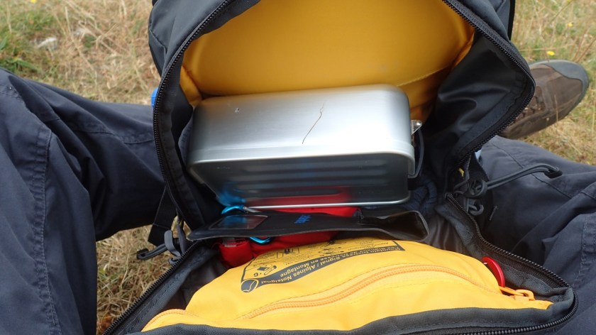In my 27lt Lowe Alpine Aeon pack, I’m able to stow a waterproof jacket, long-sleeved top, first aid kit, spares for my camera, a phone case, and lunch… All as you see and with room to spare.