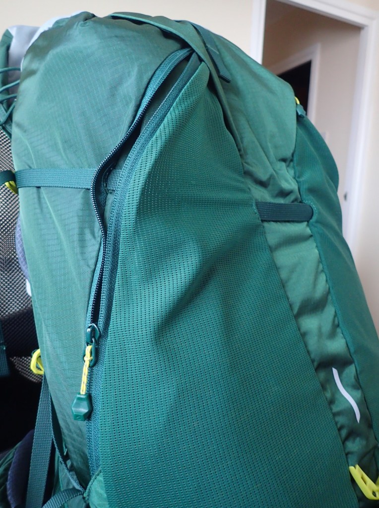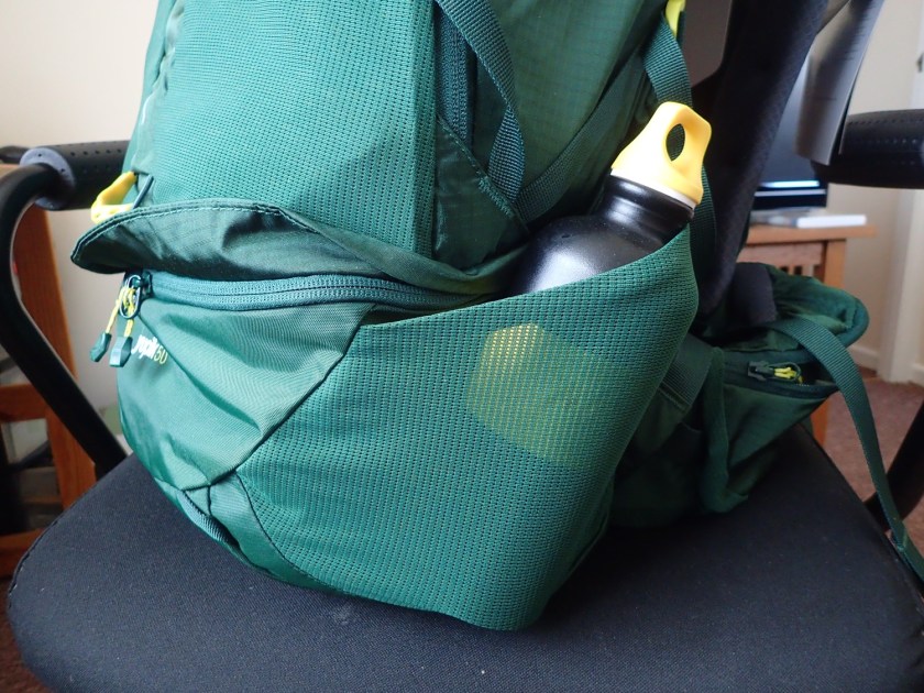Mesh pockets sit on either side of this pack at the bottom. But they’re much shorter (if also wider) than what I’m used to with Osprey and Lowe Alpine packs. I don’t intend to stash any large water bottles here and the compression straps aren’t far away. Right now, I believe it’s simply not something I’m used to.