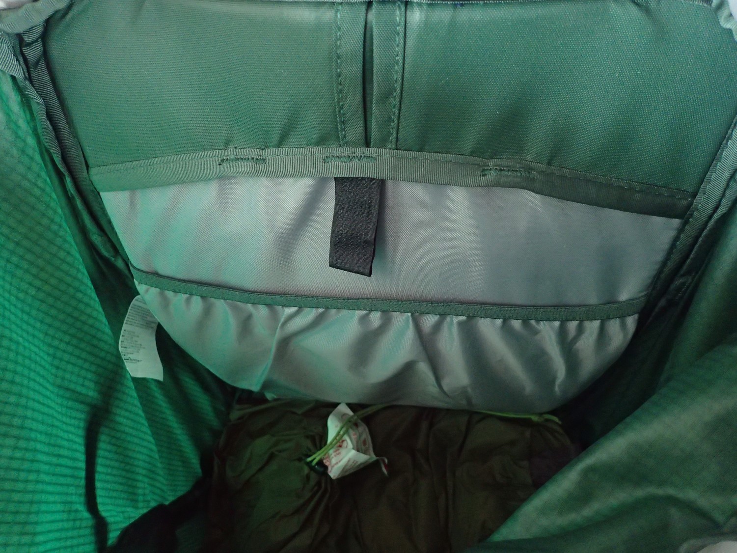 On the bottom is the common zipped sleeping bag compartment… Which I don’t like using to hold my two-season sleeping bag. Inside of this is a zipped divider that can be released to create a larger space in the main compartment. I did this with my previous Osprey pack, so I could use it as a lower quick-access point.