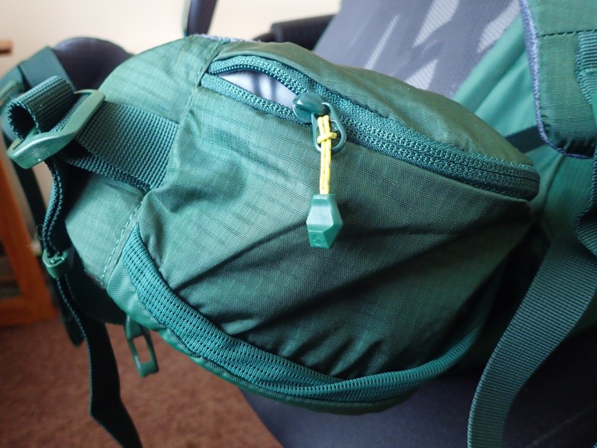 When shopping for a new pack of any size, a preference I now look for is a stretchy mesh pocket on the front of the pack. Large enough to stash and hold some of many items. This pack has two; one either side of the centre. I haven’t yet decided what to store in either of them (current thoughts include a damp tent outer for one) but I believe they’ll be very useful.