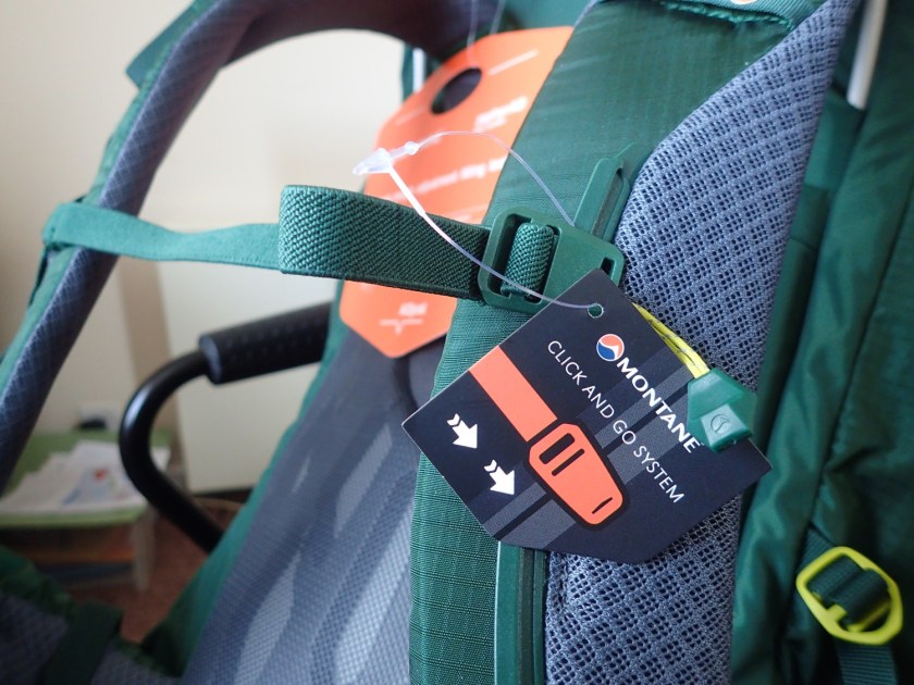 New to me was Montane’s Click-and-Go arrangement to secure the sternum strap. It may not look obvious but it’s very quick and easy to use. There’s enough ‘give’ in the stretch of the straps to keep thing comfortable. Having the plastic parts away from the centre of your body may be another benefit.