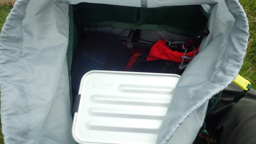 While I wouldn’t normally do this, I did pack my two-season sleeping bag in to the aptly-named sleeping bag compartment. Along with my Cloudbase-clone of an inflatable mattress and the pegs for my tent (half of which was inside the main compartment).