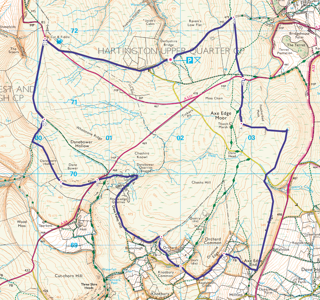 A pack of AA route cards, belonging to the owner of our accommodation, were provided with the coffee table. We drove south to a free car park next to Derbyshire Bridge (SK 018 715), from which we’d start this walk. They even have a single toilet that’s free to use, if locked overnight.