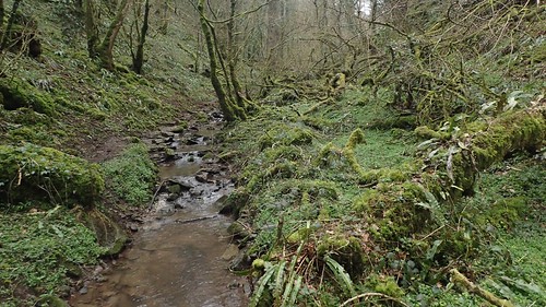 A few years ago, I was walking along Biddle Combe in Wells – across the A39 from Penn Hill and very close to a Lorry Escape Lane where I once got my car stuck… I was following the main path up through the combe and alongside a stream. Somehow, I passed the obvious footbridge on my left, crossing the stream and leading to a path climbing up the hill. I soldiered on, following a “path” (possibly animal tracks) alongside the stream. I was determined that I was going the right way; even ducking beneath two lines of barbed wire before reaching a dead-end at a boundary fence.