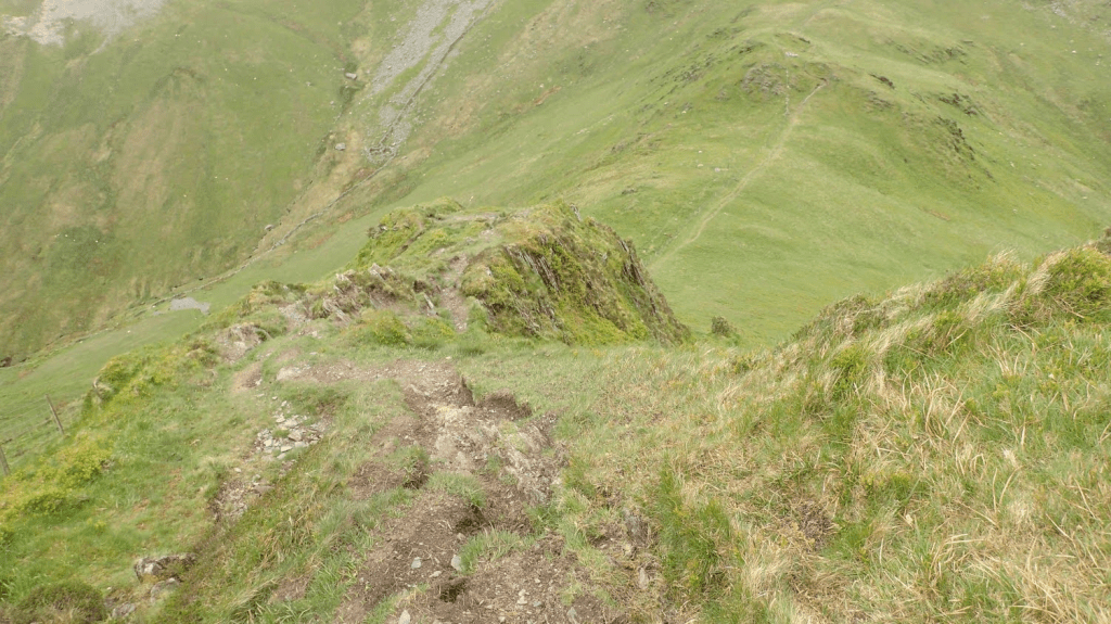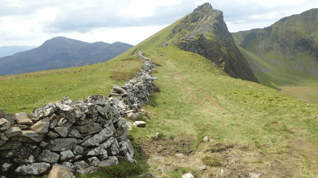 From the obelisk, I begin a descent to Bwlch Dros-bern, handrailing alongside a boundary line for navigation. From this pass, I could look up towards the brow of the ridge and again, that couple were some way ahead.