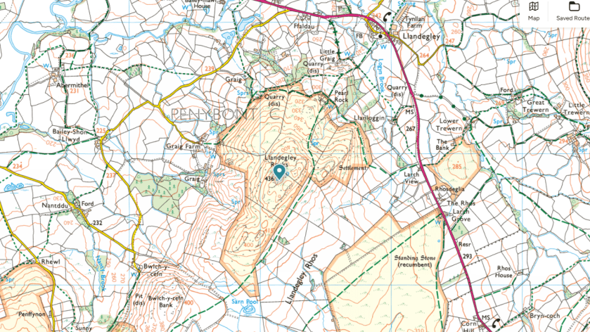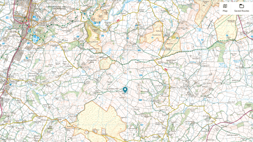 First, I’ve planted a pin on what OS Maps regards as Gilwern Hill [Powys, not Monmouthshire], to the south-east of Llandrindod Wells. You can see that there’s a lot of private land here, including the summit, with a trig point away from the nearest public right of way (a bridleway).
