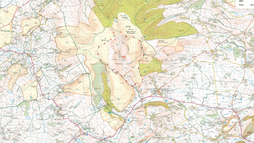 By cross-examining this image with the one from Re-Think, you can see that much of the Open Access Land around Careg-wiber Bank (to the north) and stretching as far south as Castle Bank.