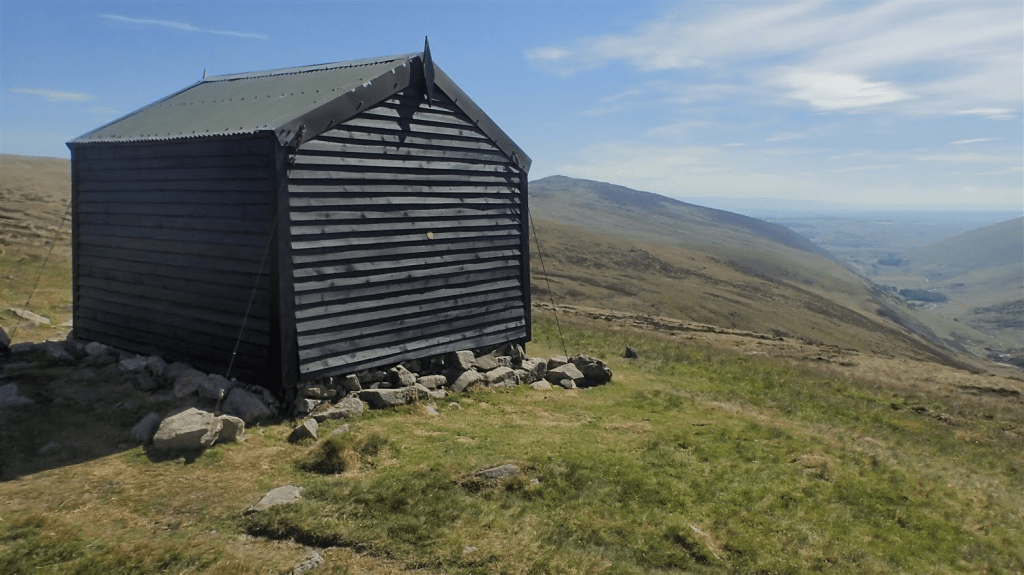But beyond that, I could see Lingy Hut. It’s marked on the OS map (although not named) and Joss had told me of it. Nick had commented on how the structure has guy lines to keep it from being whisked away in the wind, like a tent.