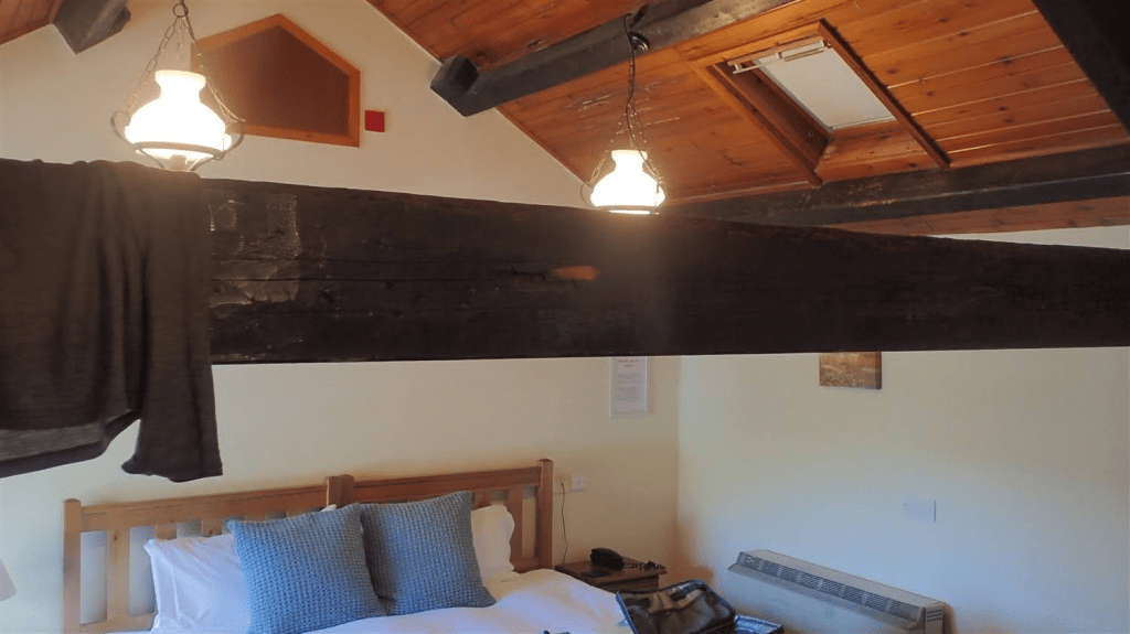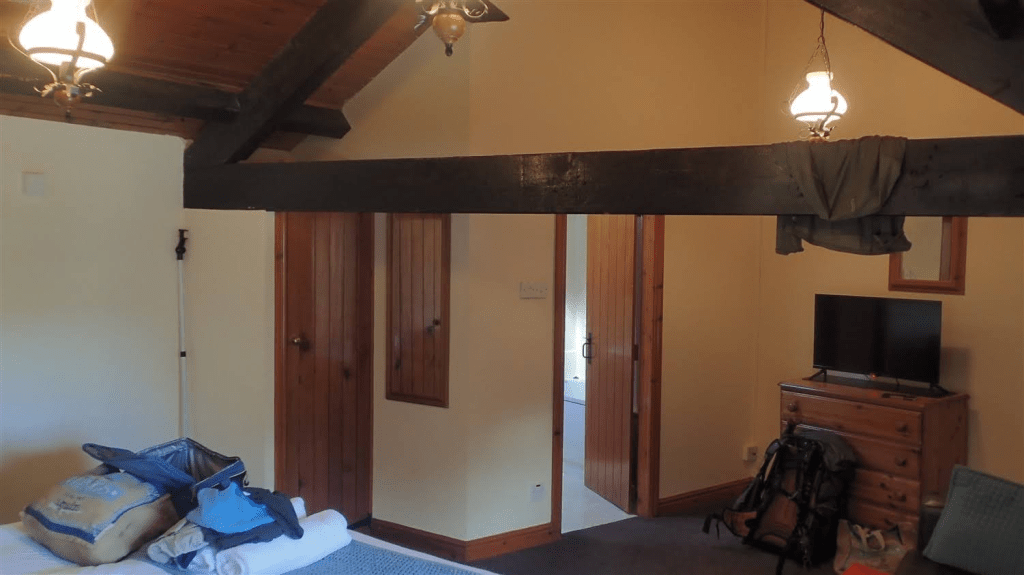 I’d like to point out that this beam is a bit of a hazard. I’m 6ft1in tall and I’d say the lower edge is roughly below the level of my eyes! You can see I hung an item over clothing over it, in the hope I’d managed to not whack my head (which did happen on at least two occasions).